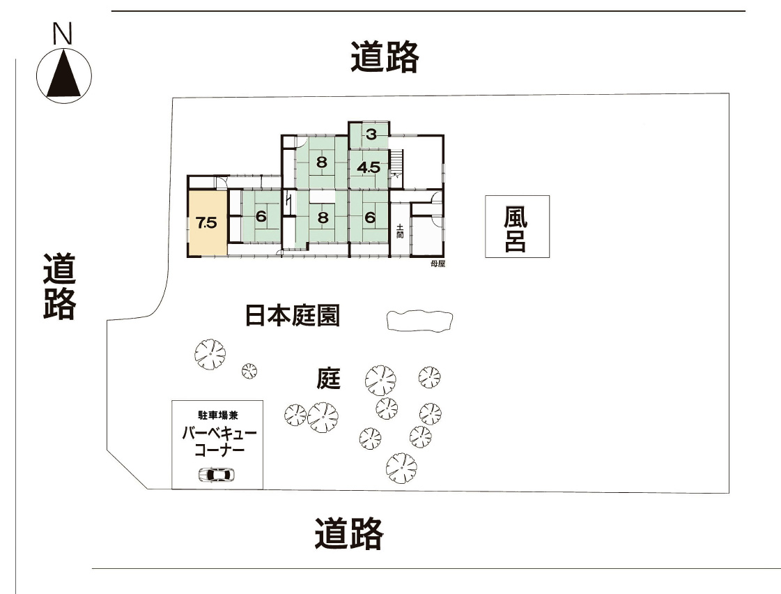 6和室(8/8/6/6/4.5/3畳)、1洋室(7.5畳)、キッチン、土間、風呂、お手洗い